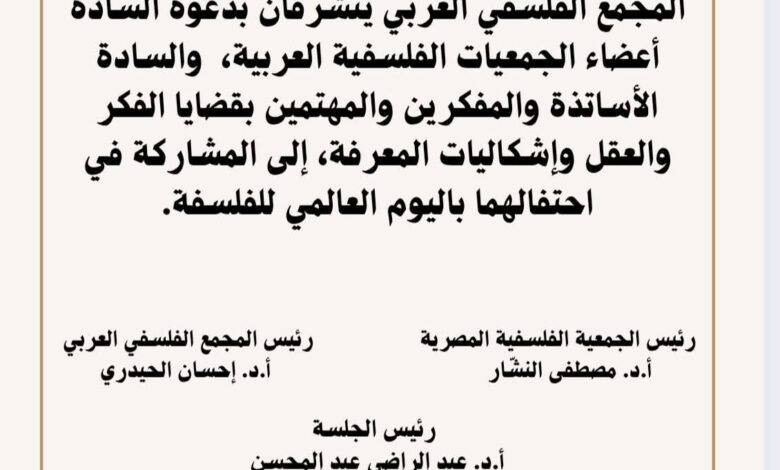 تقيم الجمعية الفلسفية المصرية بالتعاون مع المجمع الفلسفي العربي احتفالية بمناسبة اليوم العالمي للفلسفة مساء يوم الأربعاء الموافق 19/11/2025 وسيشتمل برنامج الاحتفالية على مجموعة كلمات لعدة شخصيات فلسفية من العالم العربي بحدود (3) دقائق فقط لكل متحدث وعلى النحو الآتي: